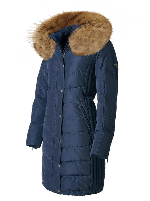 SAKI EVELYN 95 cm - Dámsky tmavomodrý páperový kabát s kapucňou a rayonom