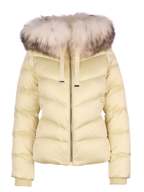 ROCKANDBLUE LEIA 63 cm – voľná pérová bunda v svetložltej farbe s pravou medvedou kožušinou